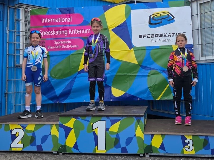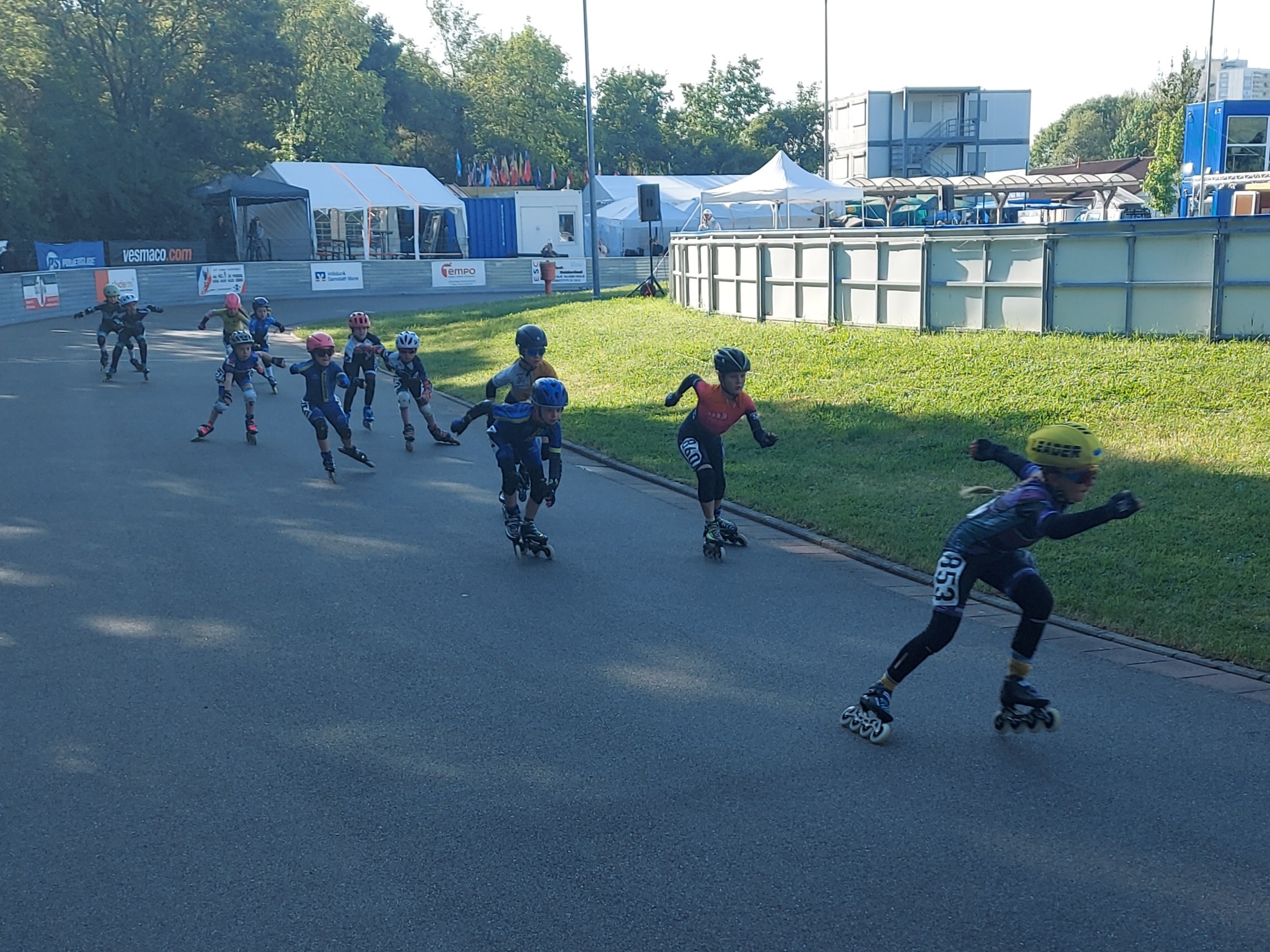 Am Samstagnachmittag gingen nun unsere „Kleinen“, Maja und Emil, zum ersten Mal an den Start. Maja ist ja schon fast ein alter Hase im Europacup und so begab sie sich gewohnt cool an den Start über ihre 1.000m Langstrecke der Schüler C. Eine Runde wurde etwas Kraft gespart und gecheckt, was die Konkurrenz so treibt, dann startete der „Maja – Express“ und mit großem Vorsprung erreichte sie unter unserem Jubel als Siegerin das Ziel. Emil hatte sich aufgrund seiner Leistungen ebenfalls einen Platz in unserem Europacup Kader verdient und startete bei den B-Schülern zum ersten Mal beim Kriterium. Seine Aufregung war schon von Weitem zu sehen. Größere Starterfelder, unbekannte Sportler, viel mehr Drumherum, als bei einem gewohnten SaThü Wettkampf, dass muss man erst einmal verarbeiten. Dazu die für ihn ungewohnte und lange Strecke über 2.000m. So dauerte es ein bisschen, bis er sich ins Rennen gefunden hatte. Mit ein bisschen mehr Mut hätte er wahrscheinlich im Hauptfeld mithalten können. Am Ende war es trotzdem ein solider Auftritt, mit einem schönen Schlussspurt auf der letzten Runde.