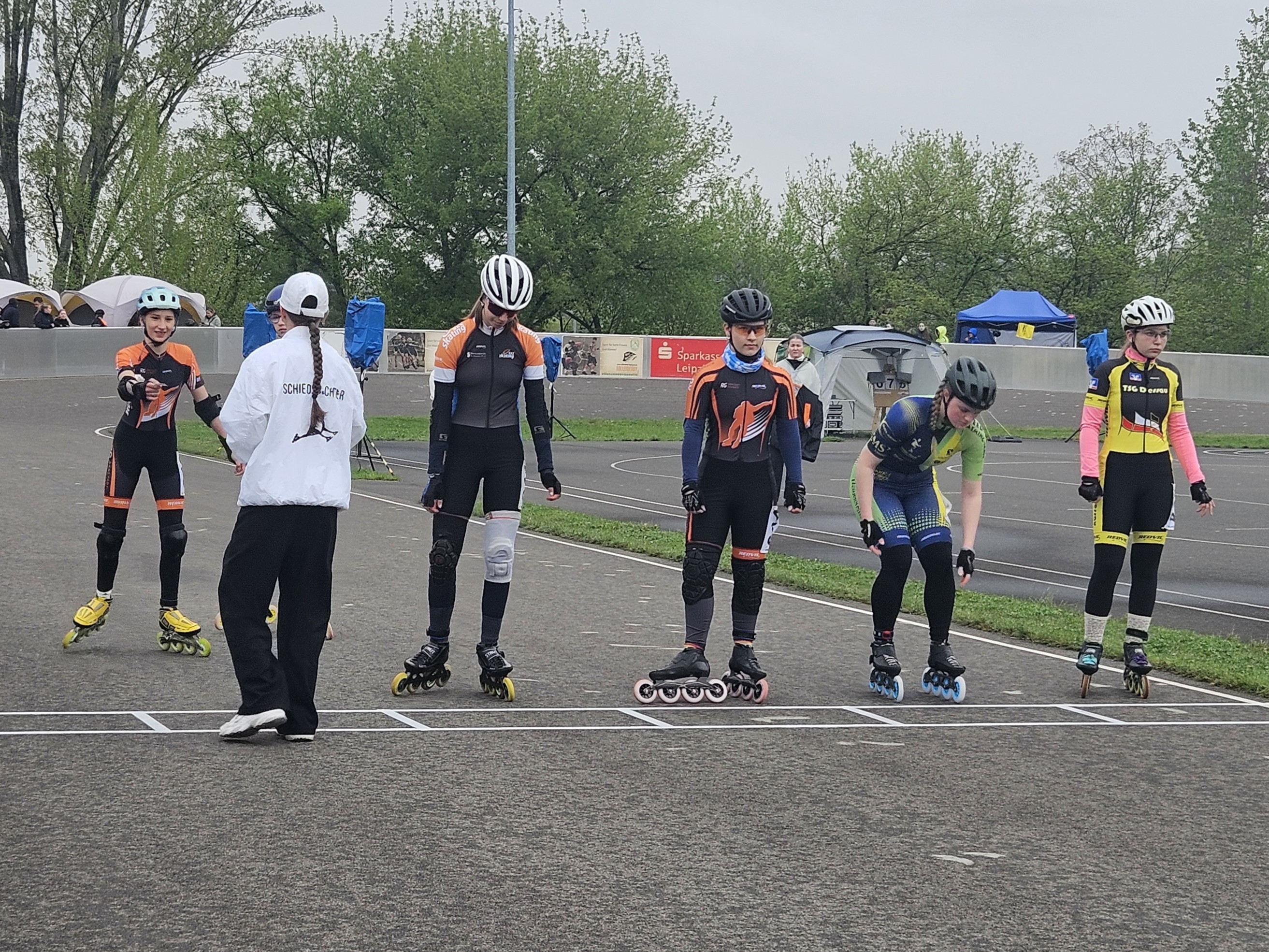 Sonntag sollten nun auch die Fitness / Breitensportler und Masters in den Wettkampf starten, dafür hatten die Anfänger und C Schüler schon Wochenende. Bei nicht ganz so schlechtem Wetter wie zunächst angekündigt, begaben wir uns wieder in Richtung Leipzig. Vorsichtiger Optimismus machte sich breit, den Tag vielleicht doch ohne große Regenschauer zu überstehen. Gleich zu beginn zeigte sich Emil mutig und ausgeschlafen über seine 1.000m Langstrecke. Er hielt in der Spitzengruppe mit, griff den Zweitplatzierten an, überholte ihn und konnte seinen 2. Platz unter großem Kampf ins Ziel retten. Nun durften unsere Breitensport Damen an den Start. Gleich drei Mädels trugen dabei die Farben des Speedskating Arnstadt. Mit Klara und Sarah-Jane zwei „alte Hasen“ aber mit Valerie auch eine Novizin. Natürlich war sie sehr aufgeregt. Alles war für sie neu, das Wettkampfumfeld, die Bahn, ihre Gegner. Nicht Letzte werden, Spaß haben und nicht stürzen, waren die drei Ziele und sie wurden erreicht. Klara konnte sich in dieser Kategorie über Platz 2 freuen und Sarah belegte einen Platz im hinteren Mittelfeld. Besonders Valerie bekam bei ihrem ersten Wettkampf gleich das volle Programm geboten und durfte, ebenso wie ihre Mannschaftskollegen, die Langstrecke bei Regen und auf Regenrollen absolvieren. Hektisches Umschrauben der Rollen war jetzt an der Tagesordnung. Auch Martha kämpfte tapfer in ihrem 2.000m Punkterennen mit den Bedingungen und um eine gute Platzierung. Ebenso mühten sich Ben, Alina und Helene auf den Langstrecken sehr. Das Wetter wurde nun zunehmend schlechter, aus Niesel wurde Regen und schließlich goss es in Strömen. Besonders Hannes erwischte es noch zum guten Schluss im abschließenden Staffelrennen. Unsere Schiris waren auch nicht zu beneiden. Trotz Regenponcho waren Hannah und Michi nass bis auf die Haut. Die Siegerehrungen konnten dann auch nur im Schutz des großen „Meeting Point“ Zeltes durchgeführt werden. Unsere Bahnzelte waren so durchweicht, dass wir uns entschieden sie vor Ort zu lassen und bei besserem Wetter abzuholen. Danke an die Leipziger für diese Möglichkeit.